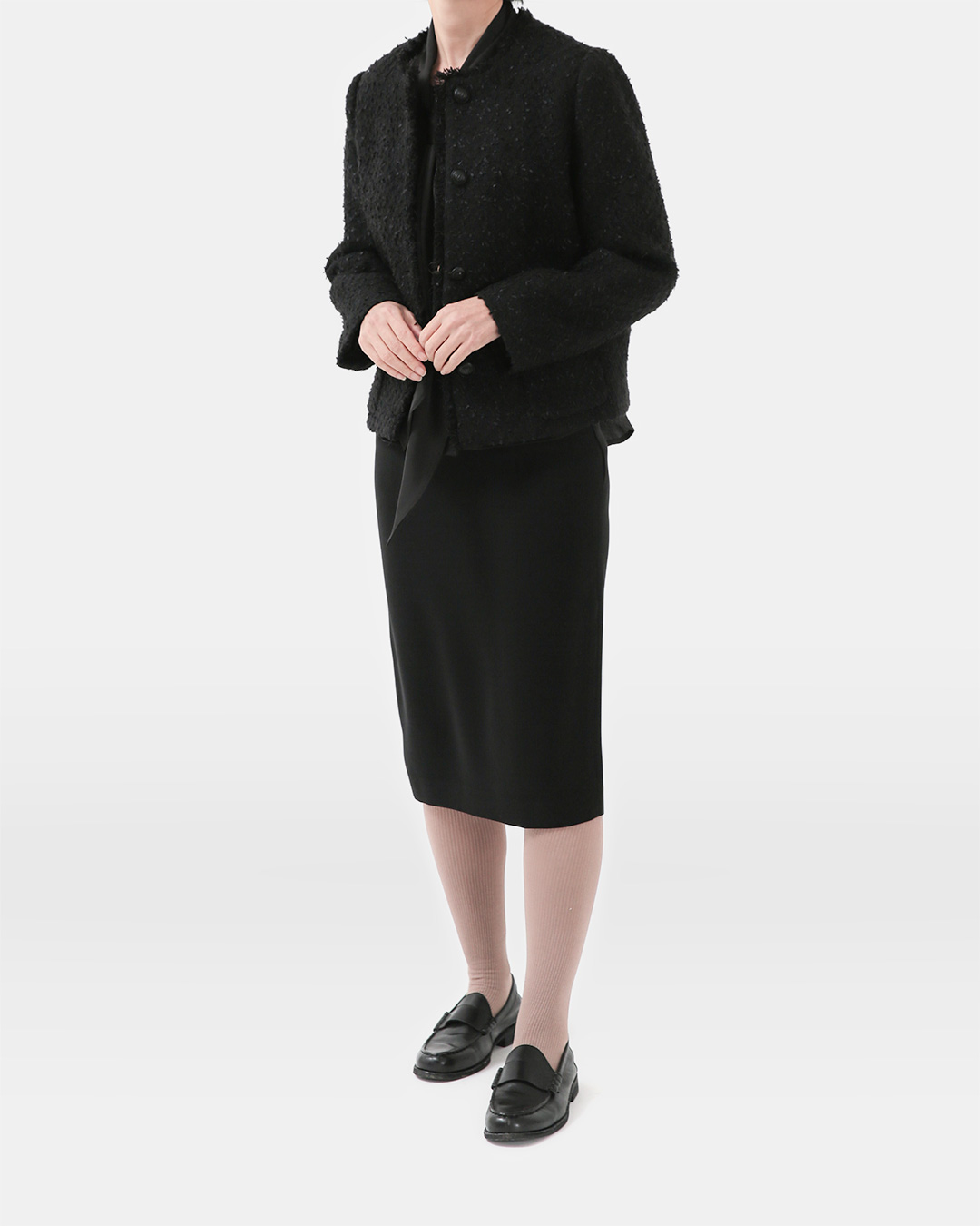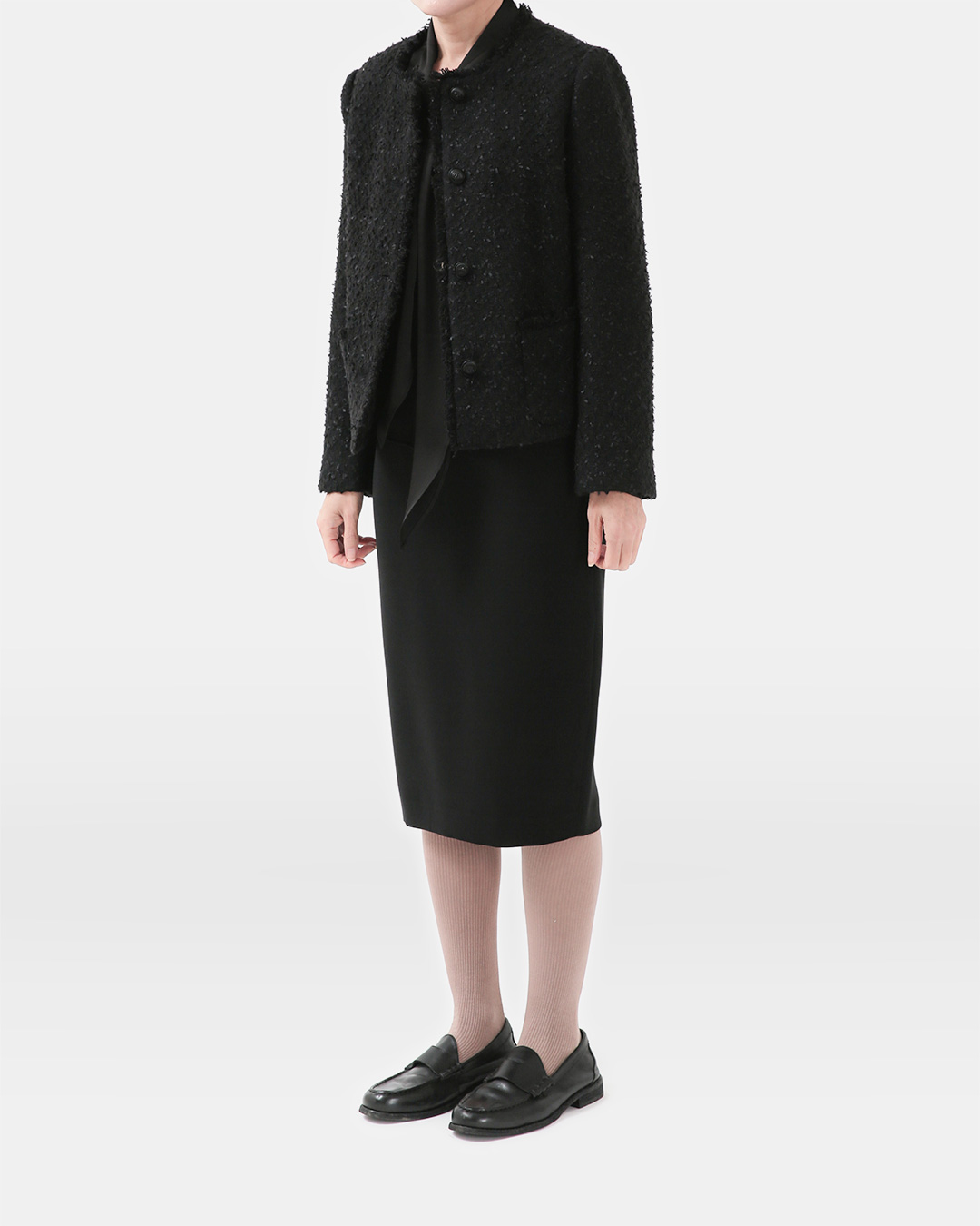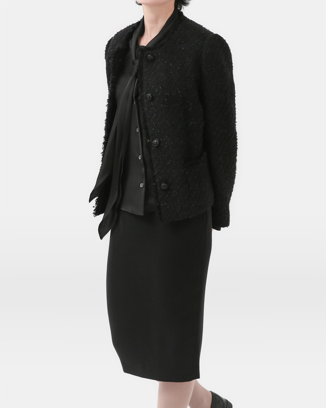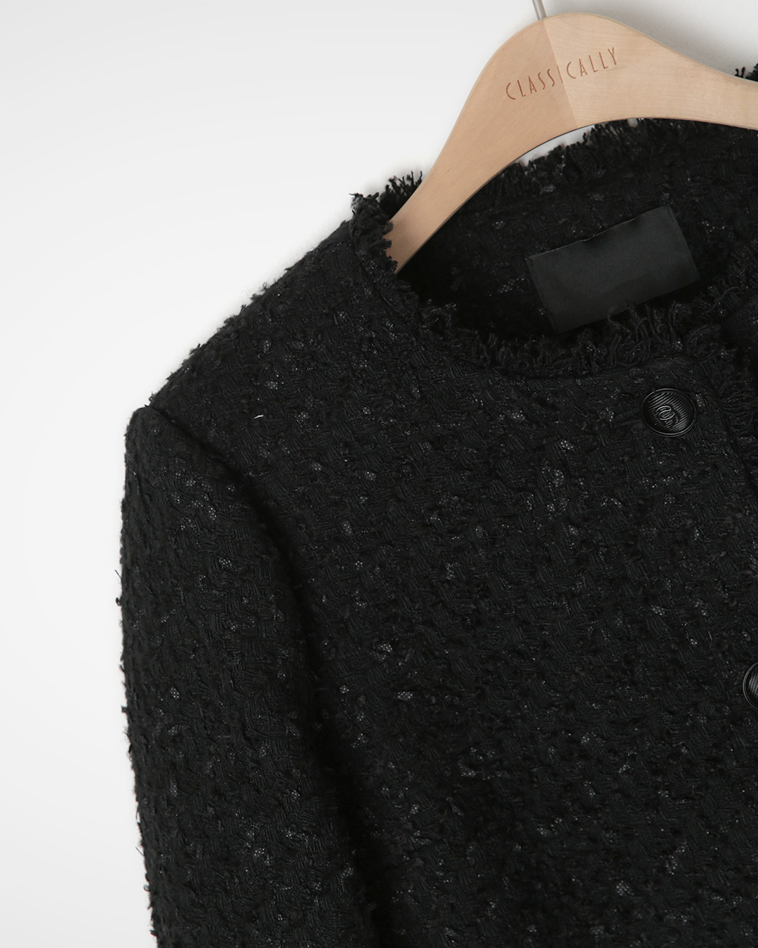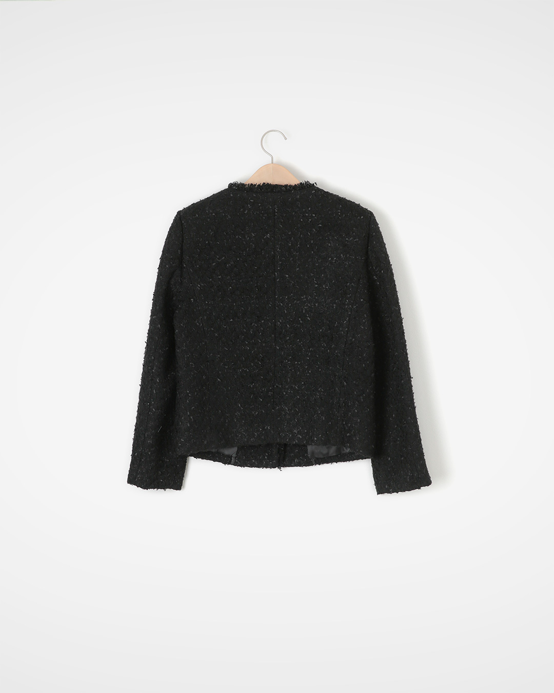 울100% 소재로 고급스럽게 연출한 트위드 재킷입니다. 은은하게 반짝이는 블랙 컬러라서 부담 없이 세련된 무드로 착용하기 좋은 제품이예요. 유행 타지 않는 타임리스한 디자인이라 옷장에 두고 특별한 순간 오래 오래 꺼내 입기 좋습니다. 6(55), 8(66), 10(77) 사이즈로 만나보세요 😊 -