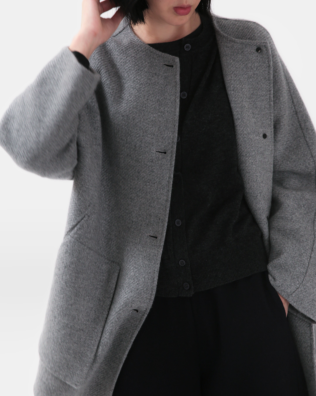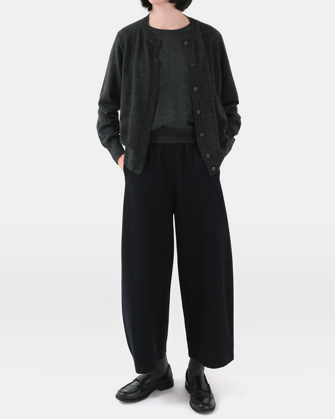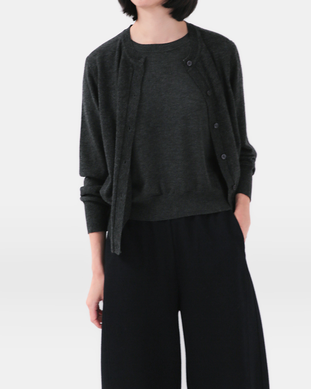 가볍고 따뜻한 울 블렌드에 담백한 실루엣을 더한 니트입니다. 이너 니트와 가디건이 분리되지 않고 한 벌로 붙어 있어서 버튼만 채우면 손쉽게 완성되는 셋업 무드를 연출할 수 있어요. 버튼을 오픈해서 스타일링 해도 감쪽 같은 한 벌! 따로 맞추지 않아도 레이어드 효과가 살아나 그만큼 편하니까 손도 더 자주 간답니다 😊 -