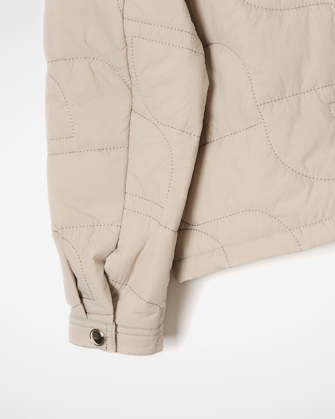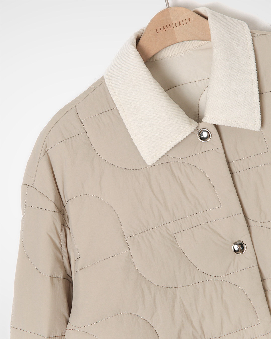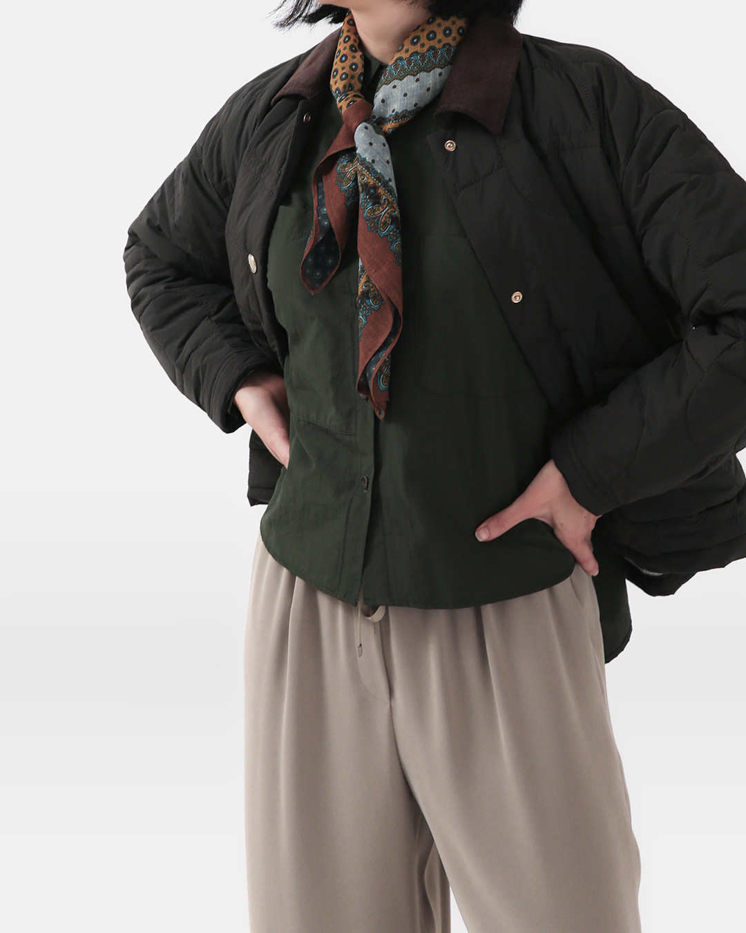 아침에 셔츠나 니트 위에 가볍게—그런데 단정함은 확실하게. 바스락한 나일론 퀼팅에 부드러운 배색 카라가 더해져 캐주얼과 포멀 사이의 균형을 딱 맞춰 줍니다. 두껍지 않지만 포근하게, 스타일은 가볍지만 존재감은 또렷한 간절기/초겨울 아우터예요. 코튼 와이드 팬츠와 로퍼로 트래디셔널하게, 블랙 팬츠와 스니커즈로 미니멀하게. 스카프나 터틀넥을 살짝 올리면 초겨울까지 멋과 보온을 함께 챙길 수 있어요 😊 -